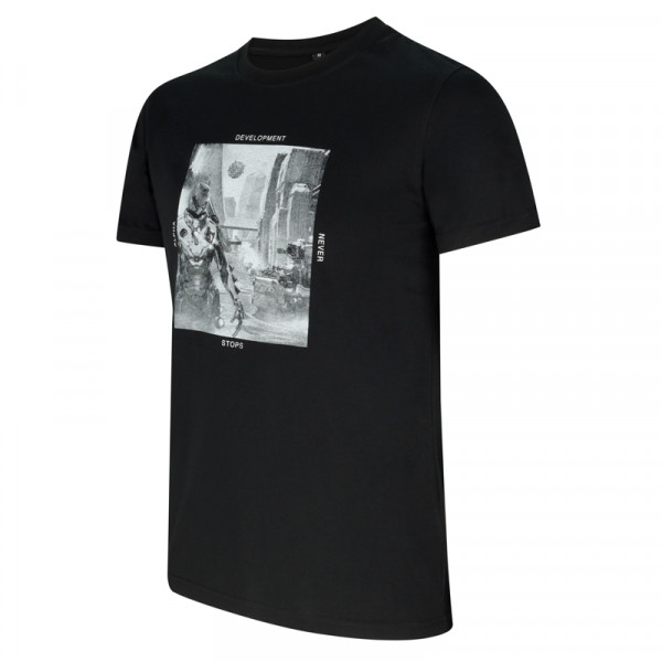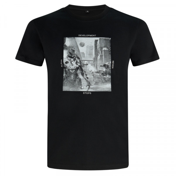 High‑quality front graphic featuring the “DEVELOPMENT NEVER STOPS ALPHA” slogan and robot artwork. -