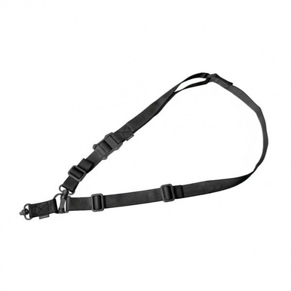 Filling the same mission requirement as the standard MS3 Sling, the MS4 can quickly switch between one-point and two-point configuration. The MS4 maintains material construction and specifications identical to that of the standard MS3, but instead of Magpul Paraclips™, it features two heavy-duty push-button QD Sling Swivels, along with a custom steel connection ring to allow one to two-point convertibility. This modification allows compatibility with QD sling cups commonly found on lower receivers, receiver end plates, buttstocks, and many low-profile forward QD Sling Mounts.